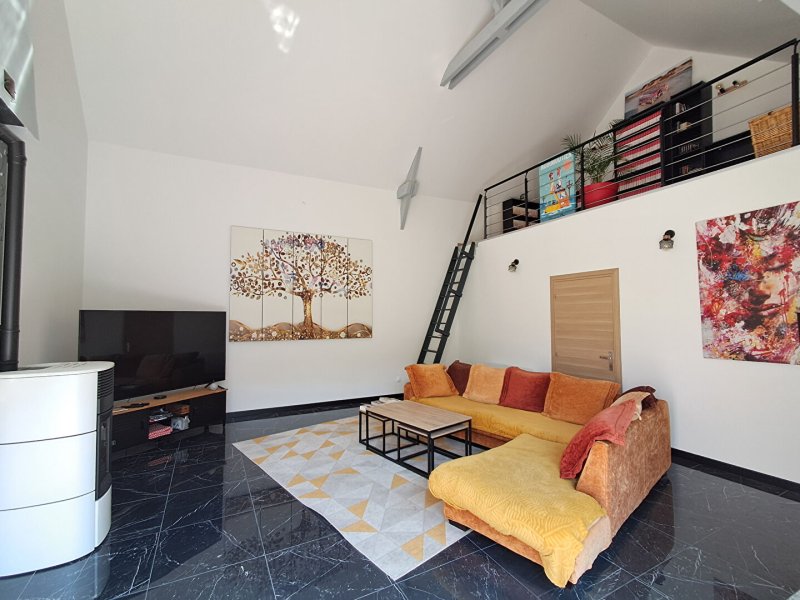 Un second salon de près de 30 m², agrémenté d'un poêle à bois, offre une atmosphère cocooning idéale pour les soirées d'hiver, et s'ouvre sur une mezzanine parfaite pour un coin lecture ou un espace détente.