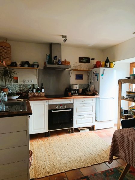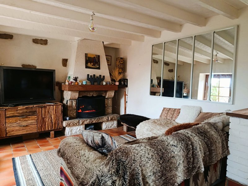 Au rez-de-chaussée, salon séjour avec cheminée, cuisine ouverte, arrière cuisine avec WC.