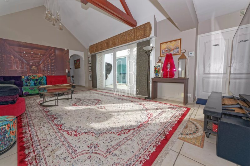 Deux espaces de vie, un premier salon sur piscine et un second salon détente, Bar, Billard. Bureau en mezzanine et dortoir.