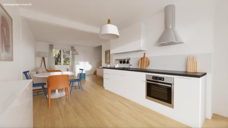 Elle offre une agréable pièce de vie avec cuisine ouverte aménagée et équipée, s'ouvrant sur une terrasse en bois et un jardin exposé Ouest, parfaits pour profiter des belles journées.