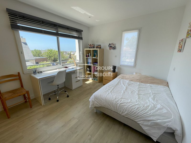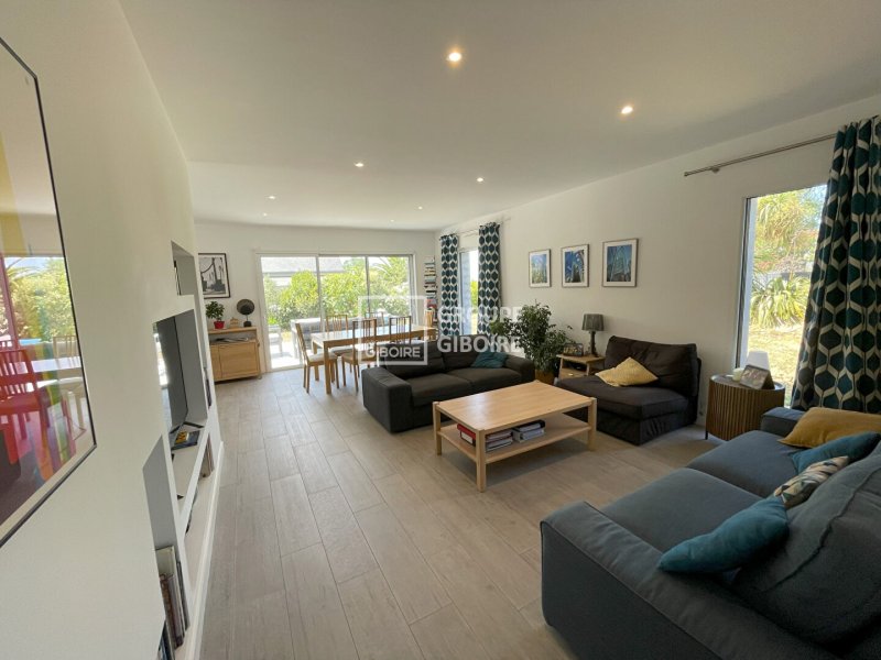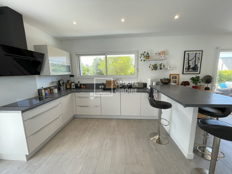 Cette maison familiale contemporaine est située à Guérande proche des remparts, offrant 150 m2 de surface habitable sur un terrain clos de 734 m².