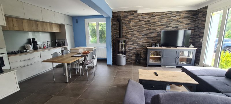 Le rez-de-chaussée se compose de trois belles chambres, d'une salle d'eau rénovée, et d'une pièce de vie lumineuse avec cuisine dinatoire récente et poêle à bois.