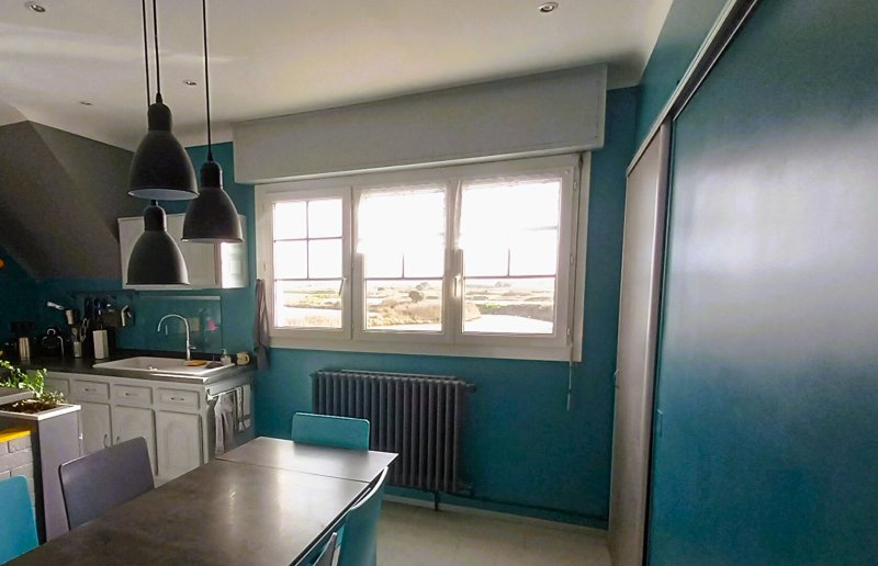 Salon séjour lumineux avec vue sur les marais salants, grande cuisine aménagée équipée, 3 salles d'eau, 3 sanitaires, combles aménagés, buanderie.
