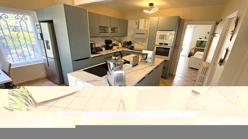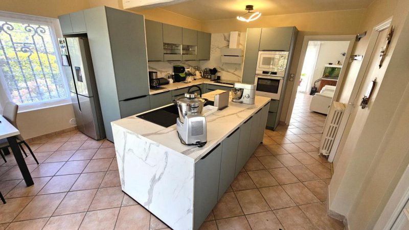 Houdan 1 mn / Maison familiale de 147 m2 comprenant au rdc : double séjour avec cheminée insert de 40 m2, cuisine dinatoire aménagée et équipée, 2 chambres avec placards, salle de douche, wc séparé.