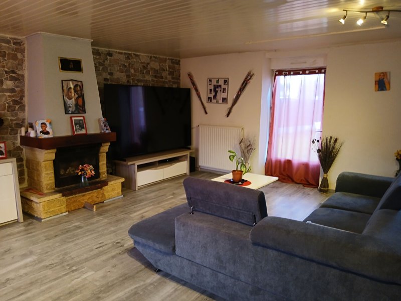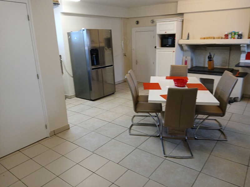 Au rdc une grande cuisine pour les repas en famille, cellier, salon séjour avec pierres apparentes et insert.