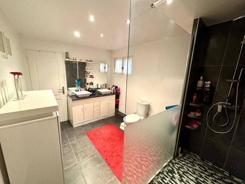 Rez-de-chaussée : une belle cuisine équipée, une salle d'eau moderne avec douche, double vasques et WC, ainsi qu'un cellier/buanderie très pratique.