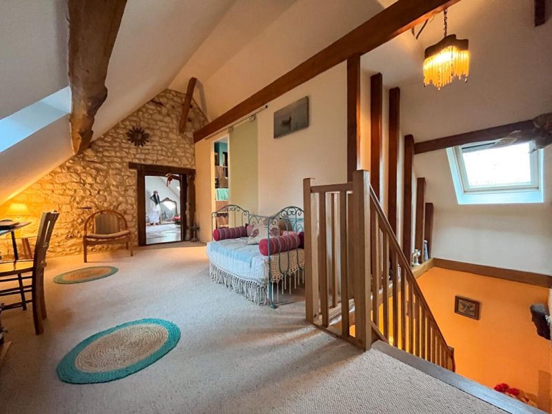 A l'étage, vous trouverez une mezzanine ouverte faisant office de salon pouvant devenir une chambre, une salle d'eau et une grande chambre.