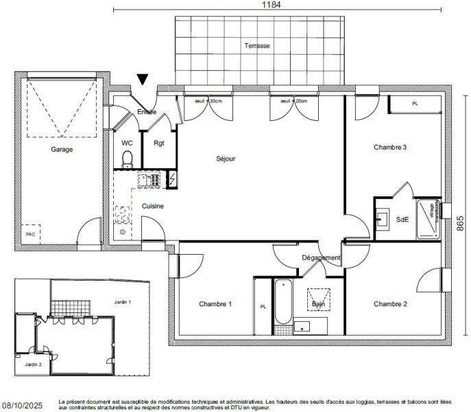 Maison de plain-pied comprenant entrée, wc, pièce de rangement, cuisine semi-ouverte sur le séjour (37m2), 3 chambres, 1 salle d'eau et une salle de bain. Un garage complète l'ensemble. Terrasse et jardin, sur une parcelle de 325 m2. Chauffage par pompe à chaleur, radiateurs basse température. L'isolation renforcée est aux dernières normes. Maison individuelle dans une résidence en copropriété à 1km de Leclerc Ylium et tous commerces.