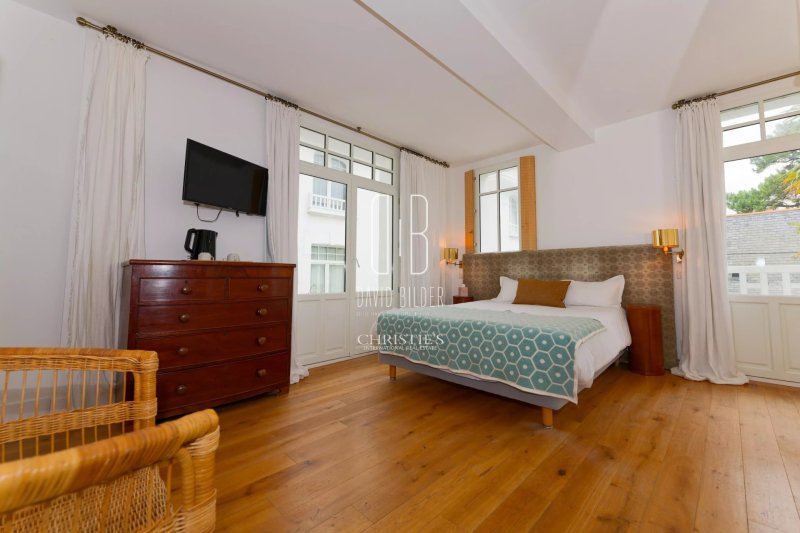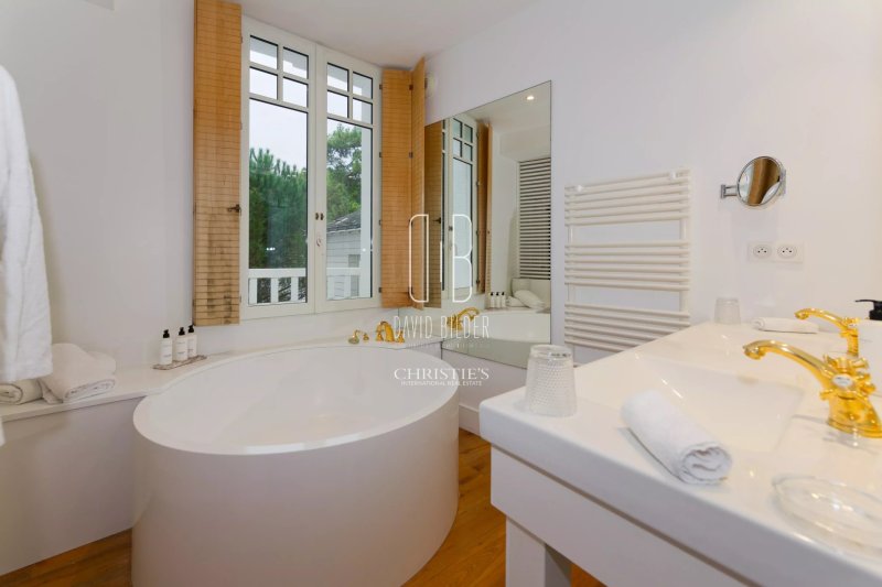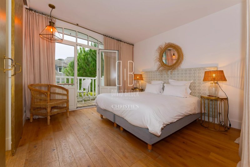 Cette demeure des Années folles, bâtisse Art Déco d'une blancheur souveraine encadrée de palmiers centenaires, s'élève en plein cœur du quartier des Oiseaux, l'écrin résidentiel le plus prisé de la côte atlantique. À cents mètres de l'une des plus belles plages d'Europe, à l'abri des regards, dans le silence des pins.