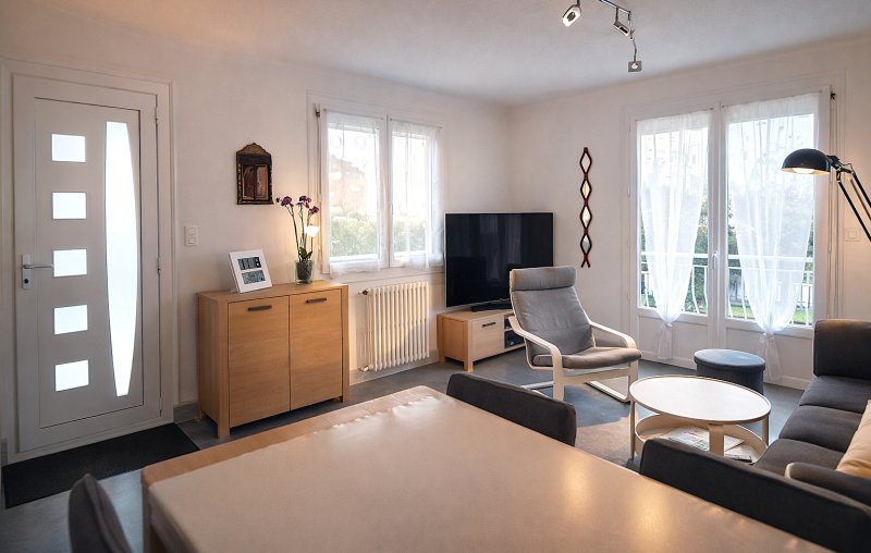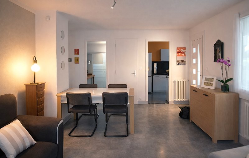 Elle propose une vie de plain-pied avec une lumineuse pièce de vie, une cuisine aménagée et équipée, deux chambres, une salle d'eau ainsi que des WC séparés.