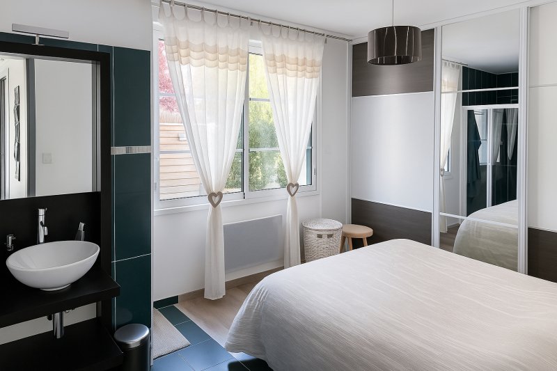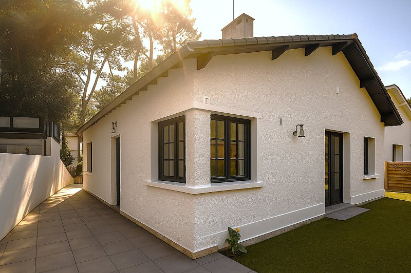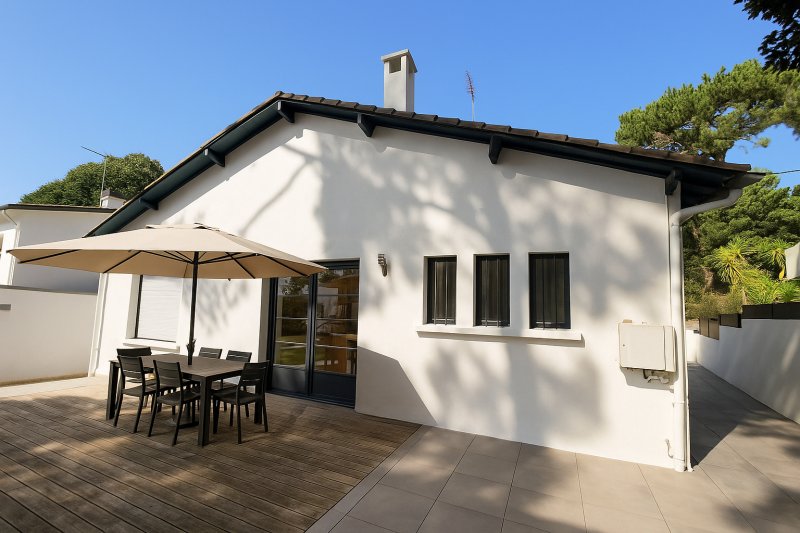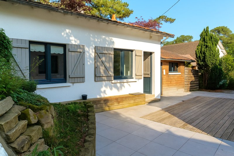 LA BAULE LES PINS - Charmante villa de type basque, idéalement située dans un environnement calme et résidentiel, dans le quartier balnéaire de la Baule les Pins, à 600m de la baie de LA BAULE et à 800m des commerces de Lajarrige. Maison de plain pied, comprenant dans la partie principale une belle pièce de vie avec cuisine aménagée/équipée, donnant sur la terrasse exposée S/O, 2 chambres chacune avec sa salle d'eau. WC séparés, buanderie, nombreux placards. Un appartement complète le bien, avec une chambre + salle d'eau, un salon cuisine, WC séparés. Dépendances, abri de jardin, combles aménageables (20m²)
