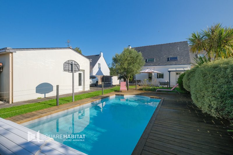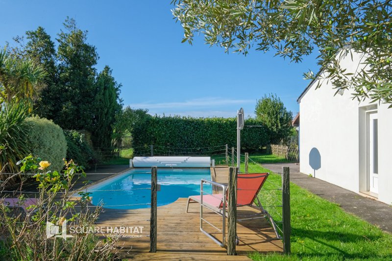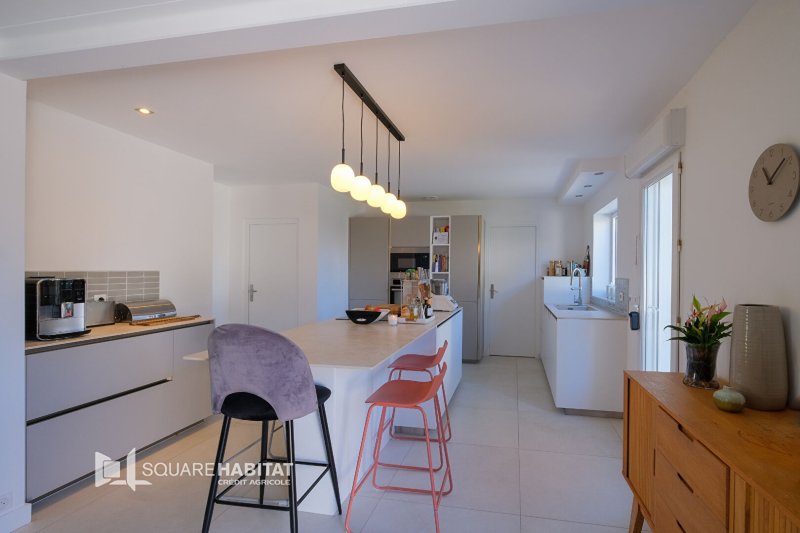 Une entrée avec placard vient desservir un bel espace de vie salon séjour agrémenté d'une cuisine aménagée et équipée, le tout prolongé de sa vaste terrasse exposée sud et donnant sur une piscine chauffée.