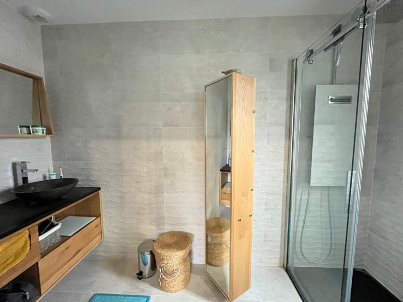 Elle dispose au rez-de-chaussée d'une superbe pièce de vie traversante avec grandes baies vitrées donnant sur des terrasses, d'une cuisine ouverte aménagée et équipée, d'une suite parentale avec dressing et salle d'eau privative, ainsi que d'une lingerie.