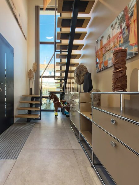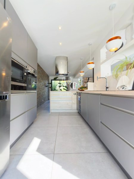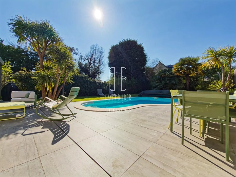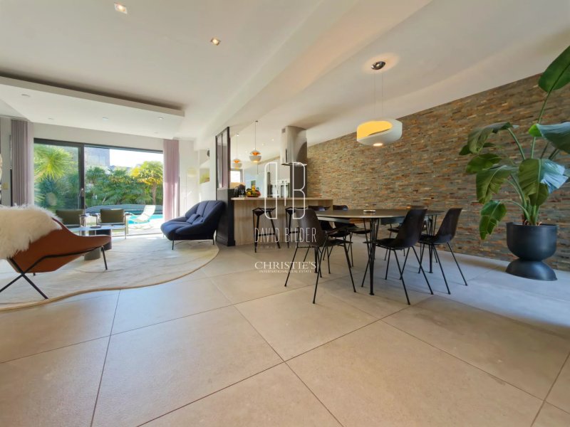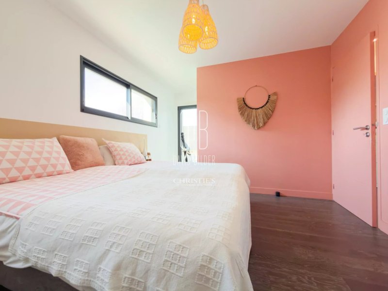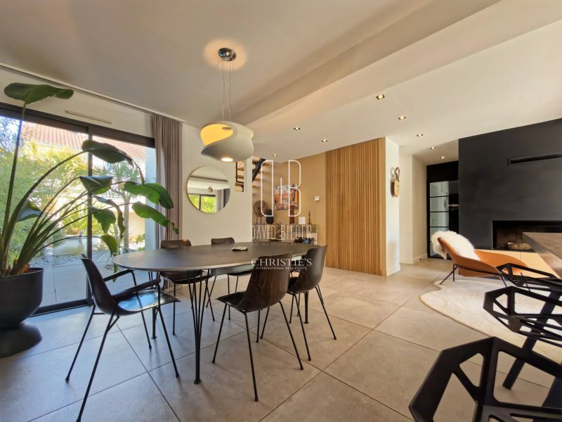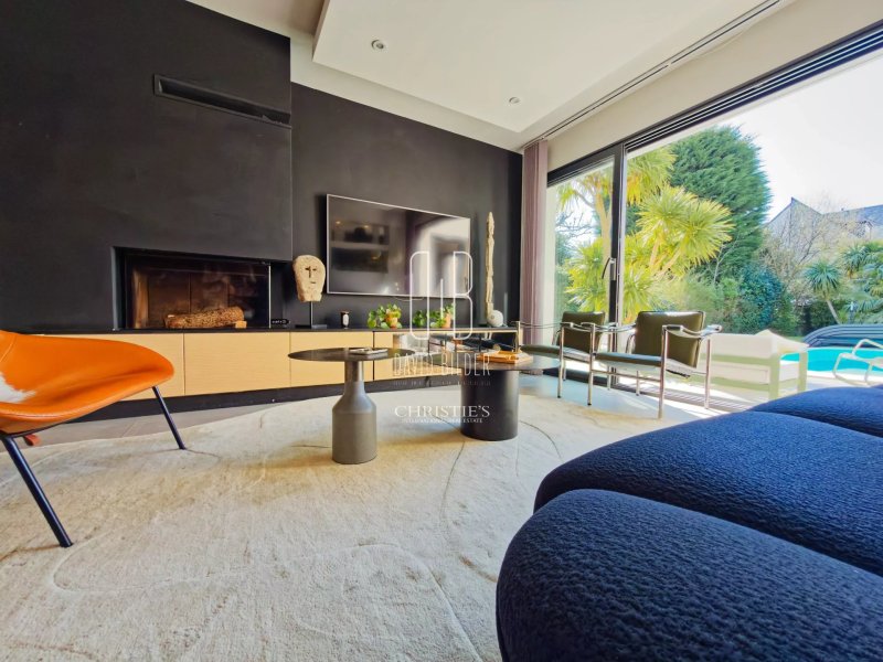 Au rez-de-chaussée, un grand espace de vie baigné de lumière s'ouvre sur la terrasse et la piscine, avec une cuisine équipée haut de gamme. Une chambre avec salle d'eau privative complète ce niveau, ainsi qu'une salle de sport vue sur jardin et une buanderie.
