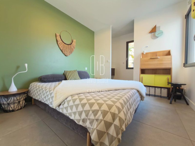 À l'étage, trois suites avec salles d'eau dont la suite principale avec dressing, et une terrasse privée avec vue plongeante sur le jardin exotique et la piscine chauffée couverte.