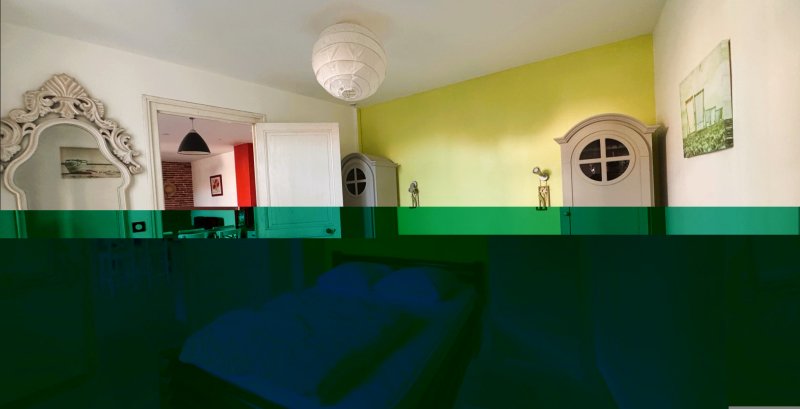 La maison principale (70 m²) se compose au rez-de-chaussée d'un séjour lumineux avec cuisine aménagée et équipée, et d'un WC séparé.