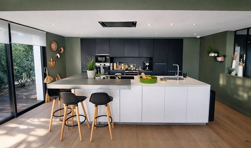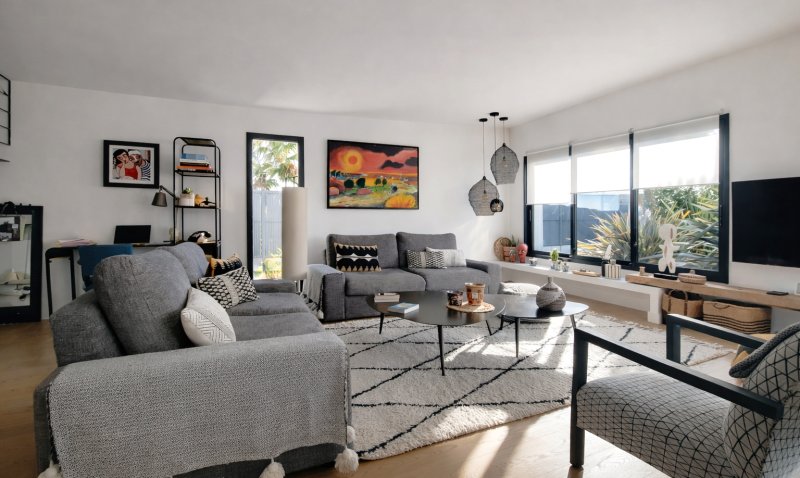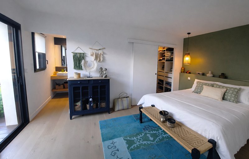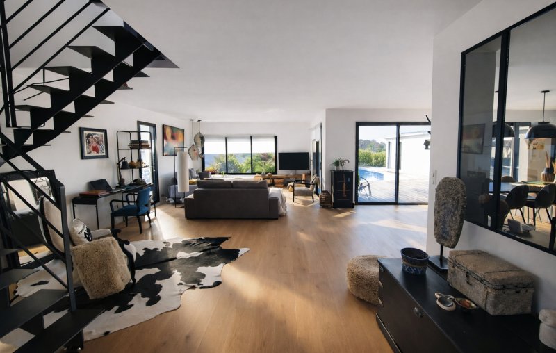 Elle propose de très beaux volumes, avec au rez-de-chaussée, la pièce de vie salon/séjour/cuisine A/E de 75m² qui s'ouvre sur la terrasse, la piscine et le pool house, le tout exposé au Sud.
