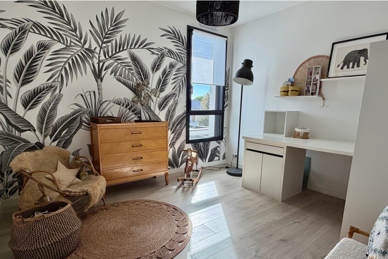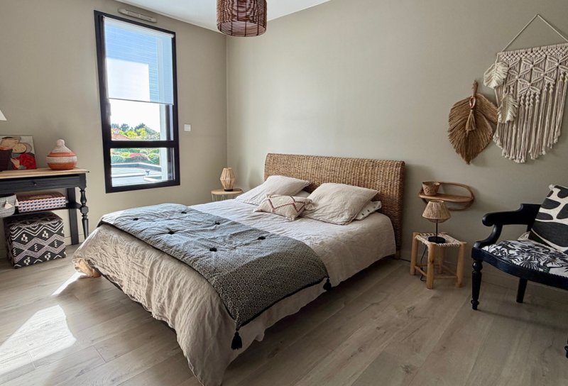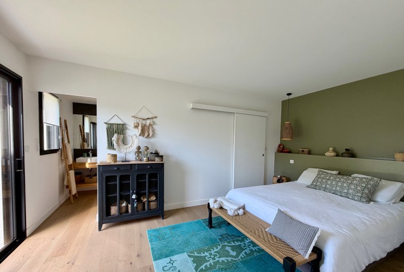 La maison permet une vie de plain-pied confortable grâce à une élégante suite parentale avec dressing et salle d'eau.
