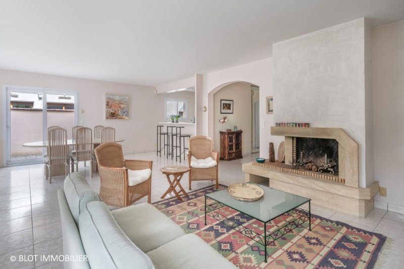 Cette propriété lumineuse et parfaitement entretenue offre une vie de plain-pied avec une grande pièce de vie de plus de 49 m² avec salon, salle à manger, agrémentée d'une cheminée ouverte, prolongée d'une vaste terrasse exposée sud. Une cuisine ouverte aménagée et équipée, une buanderie, une chambre avec salle de bains, douche attenante et WC séparés complètent ce rez-de-chaussée.