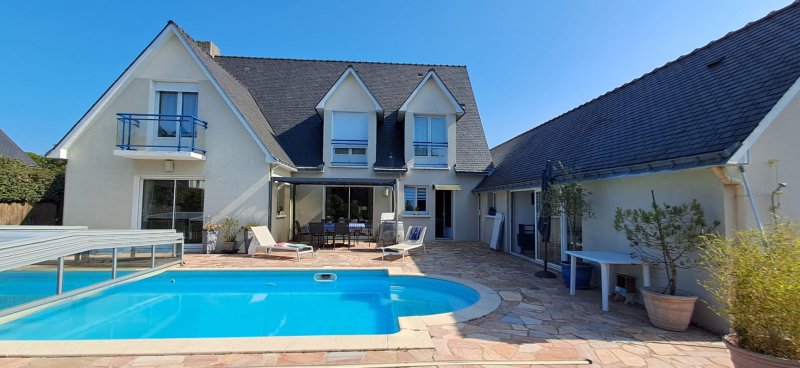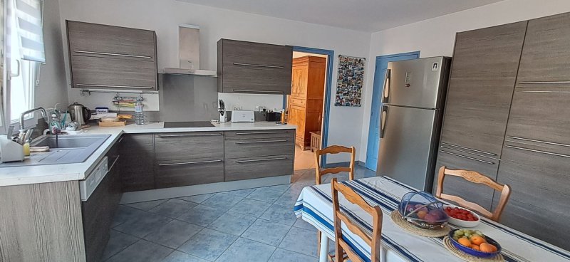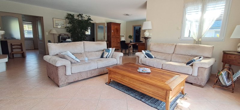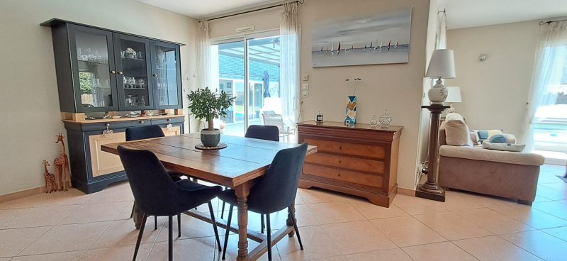 Sur une parcelle d'environ 900 m2, maison de 2002 .entrée avec placards ouvrant sur un spacieux salon-séjour , une chambre avec salle de douche, un bureau , cuisine indépendante aménagée et équipée, arrière-cuisine, salon d'été et 2 wc. A l'étage, 1 mezzanine dessert 4 chambres toutes sur parquet ainsi qu'une salle de douche et d'un wc et une salle de douche avec wc. Garage avec cave à vin enterrée.