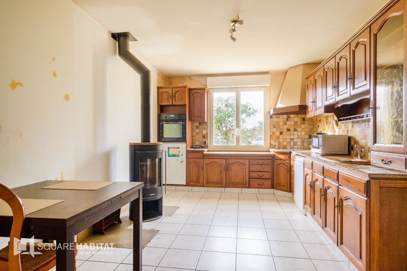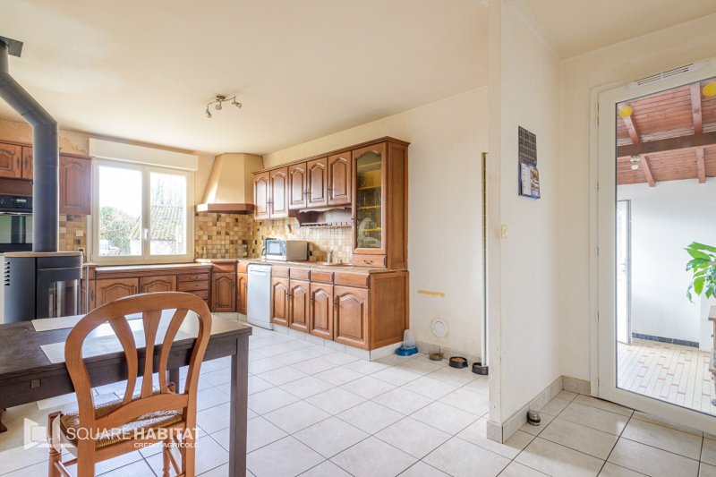 Elle s'ouvre sur une entrée desservant une première chambre, ainsi qu'une salle d'eau avec WC. La cuisine aménagée et équipée, chaleureuse et conviviale, est agrémentée d'un poêle à bois, parfait pour les soirées d'hiver.