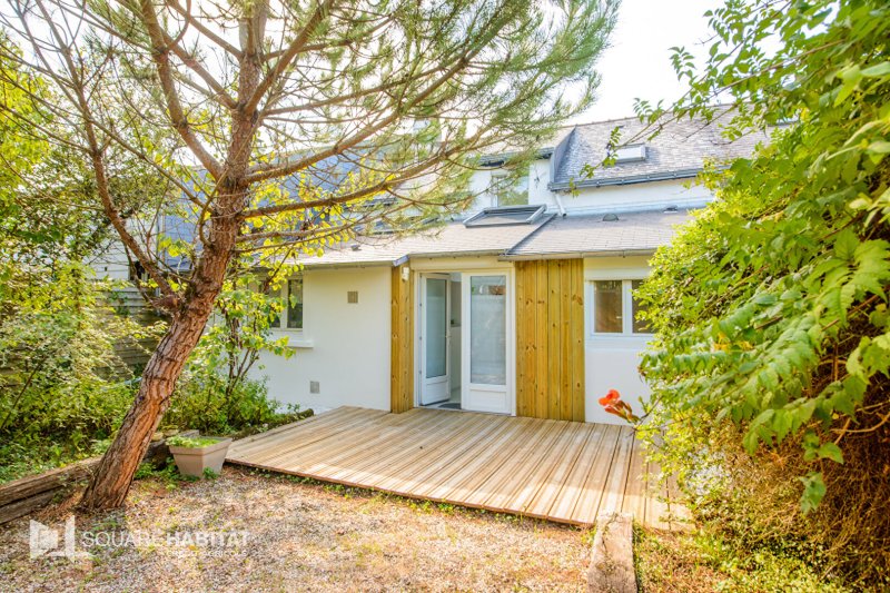 Une cour devant pour garer les voitures, un joli jardin arboré à l'arrière avec sa terrasse en bois.