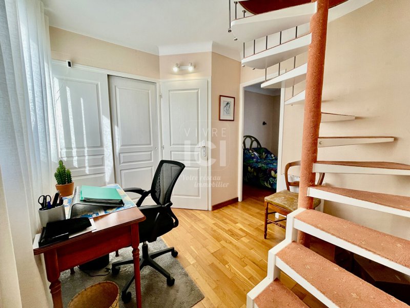 A l'étage une mezzanine et une chambre complètent l'ensemble, permettant d'imaginer aisément une quatrième chambre ou un espace professionnel.