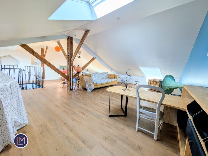 À l'étage : vaste pièce aménagée dans les combles avec grand Velux (espace bureau, salle de jeux, chambre d'appoint, atelier d'artiste)