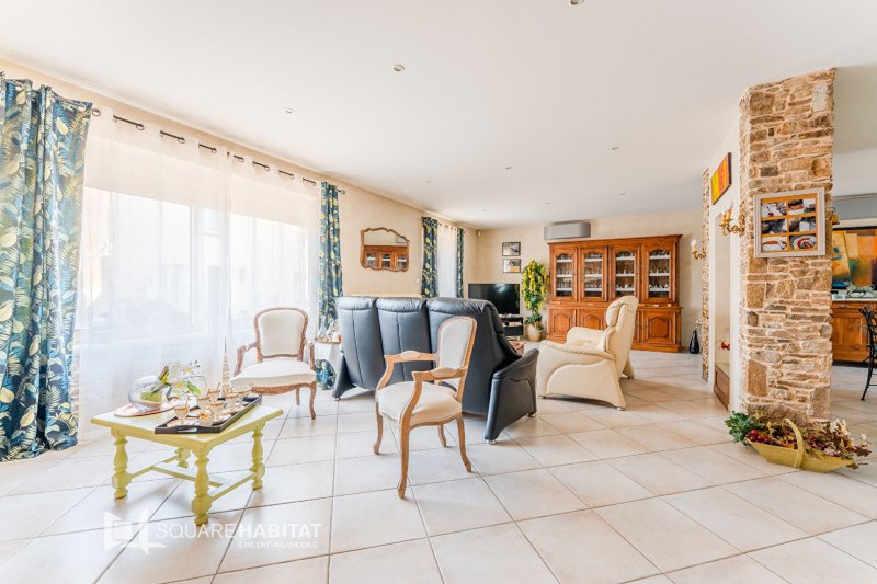 Elle se compose au rez-de-chaussée d'un hall d'entrée avec placard, d'une belle pièce de vie pleine de charme, d'une cuisine dinatoire équipée et aménagée, une buanderie, ainsi que d'une partie nuit permettant une vie de plain-pied avec chambre, salle d'eau et WC.