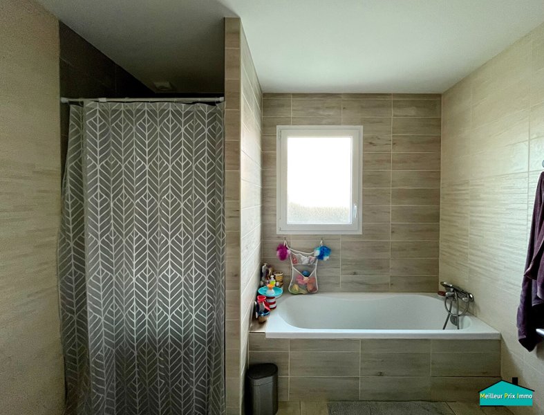 Prestations de qualité : pompe à chaleur, ouvertures aluminium, cuisine et finitions réalisées par artisans (peinture, salle de bains, sols).
