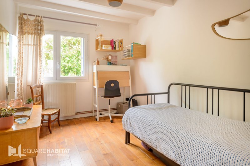 A l'étage, un palier desservant 2 chambres, un bureau, une salle de bain avec wc. Combles aménagés.