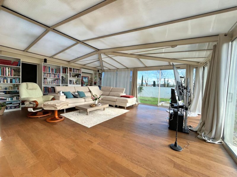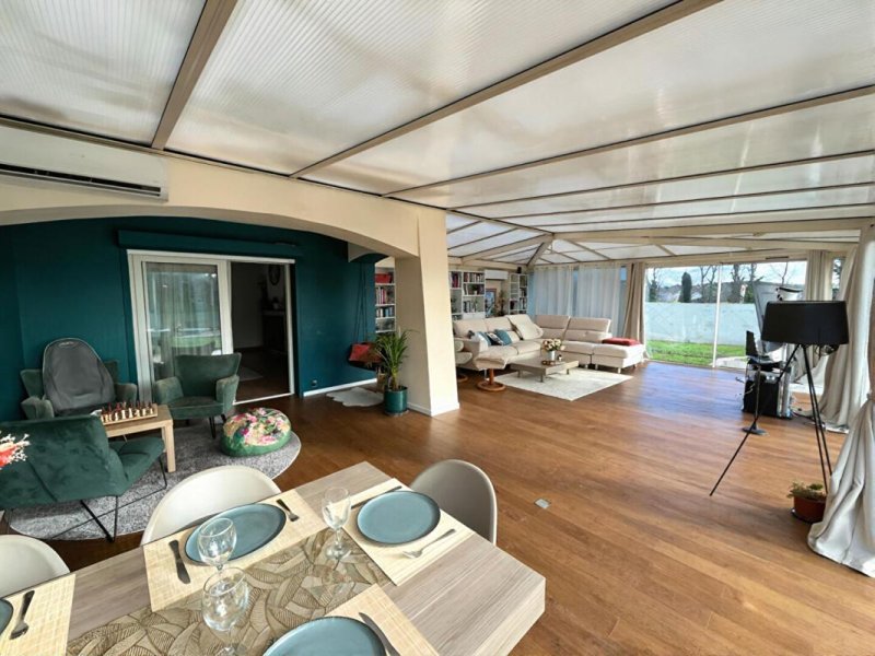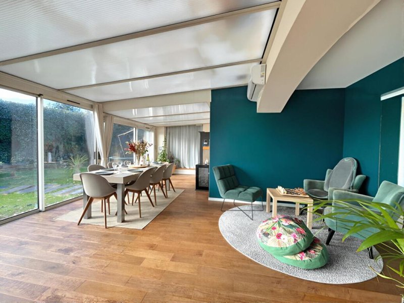 Le coeur de la maison bat dans sa superbe véranda de 65 m² , véritable pièce de vie baignée de lumière qui prolonge un séjour chaleureux avec insert.