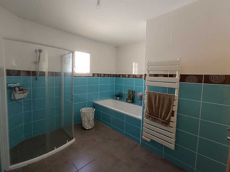 Salle de bain (douche + baignoire, double vasque), WC séparé, Cellier (WC + douche + évier) , Garage 20 m² + cabanon