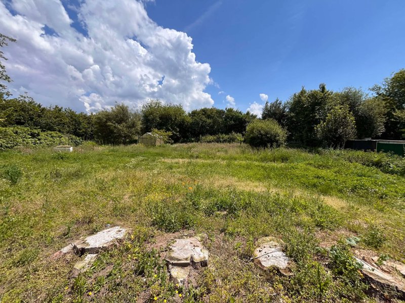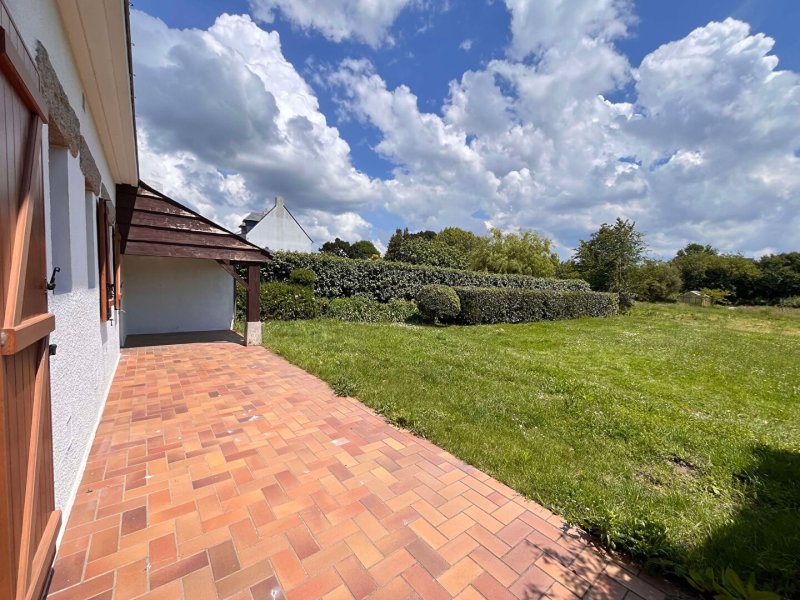 Garage attenant avec mezzanine, préau, et belle terrasse ensoleillée offrant une vue dégagée sur le jardin.