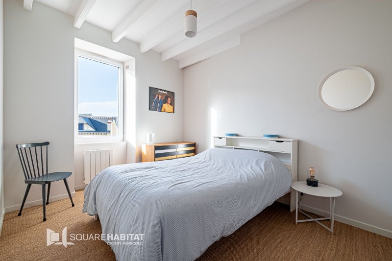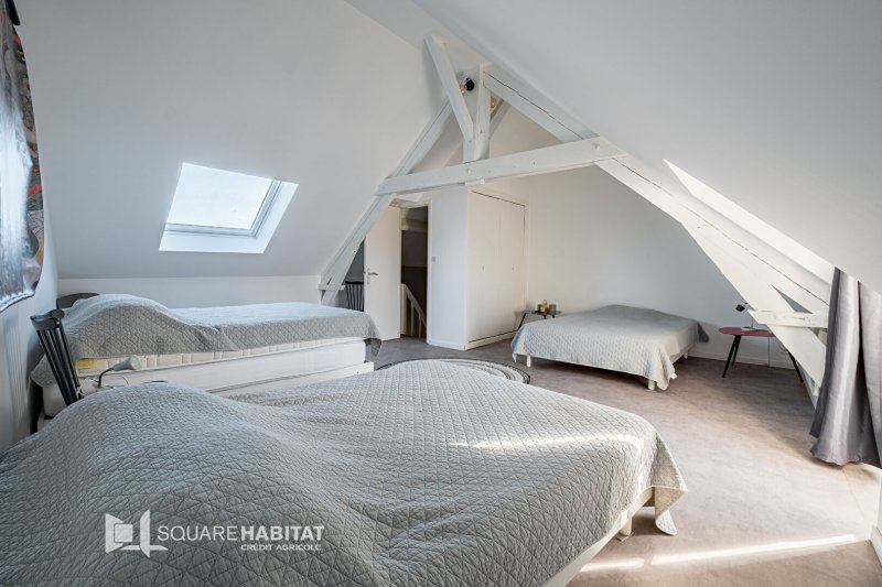 Le dernier étage offre une vaste chambre sous toit cathédrale, idéale pour un espace parental, un bureau ou une salle de jeux.