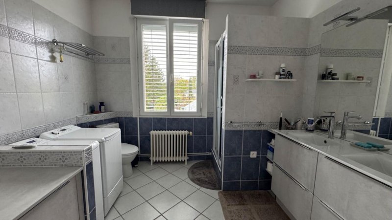 Au premier étage, un palier dessert une salle d'eau moderne avec WC, ainsi qu'une chambre spacieuse bénéficiant d'un dressing sur mesure.