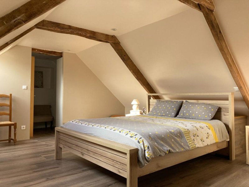 - Séjour de 38 m² avec poutres apparentes et cheminée équipée d'un poêle à bois (aux normes)