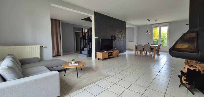 Dès l'entrée, la maison surprend par ses volumes généreux. Le hall spacieux de 20 m² ouvre sur une pièce de vie chaleureuse où le poêle à bois suspendu apporte une atmosphère conviviale lors des soirées d'hiver.