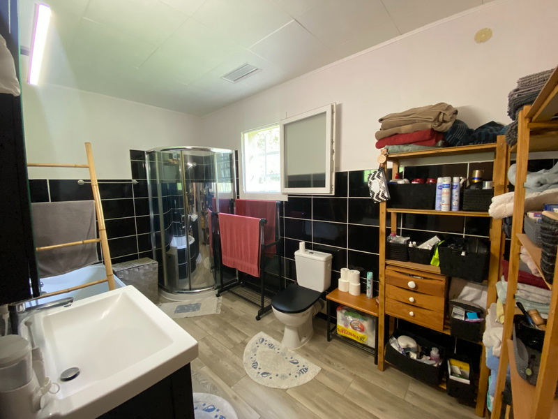 La maison composée de plain pied d'une véranda, d'un large séjour /salon / cuisine équipée ouverte pour une surface totale d'environ 60 m2, une arrière cuisine, deux grandes chambres dont une avec dressing, une salle de bains/douche/wc. A l'étage un large palier, deux chambres , une salle d'eau/wc.