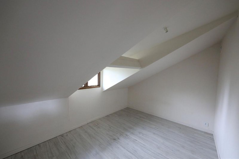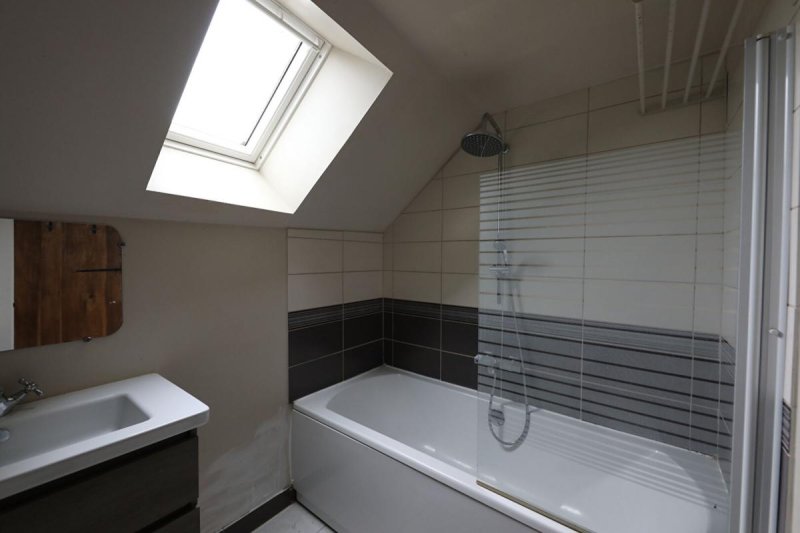 Maison mitoyenne de 90 m² habitable comprenant au rez-de-chaussée une entrée desservant une pièce de vie avec poêle à bois , une cuisine donnant accès au jardin et une salle de bains avec toilettes.