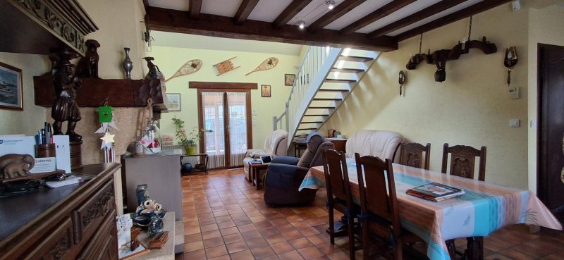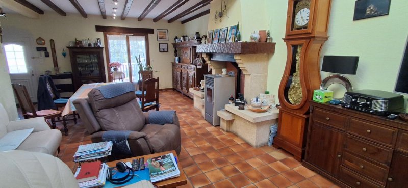 Vaste pièce de vie de 40 m² avec cheminée et poêle à granulés récent, offrant une chaleur douce et économique.