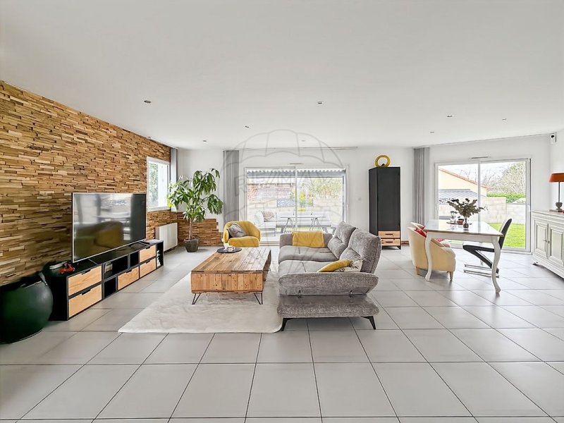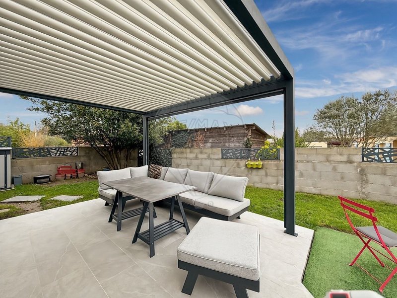 La pièce de vie donne un accès direct à une terrasse carrelée équipée d’une pergola bioclimatique, idéale pour profiter des extérieurs en toute saison.