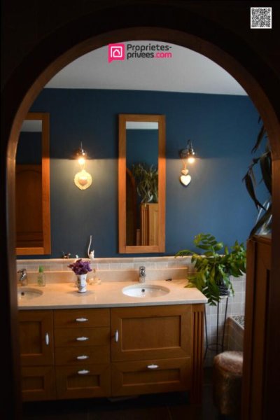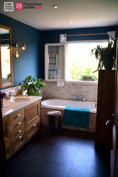 A l'intérieur, un espace de vie d'environs 50m2 et une vaste cuisine, une buanderie avec accès au sous sol total de la maison, 3 chambres avec placard, une magnifique salle de bain avec meuble double vasque, baignoire et douche à l'italienne.