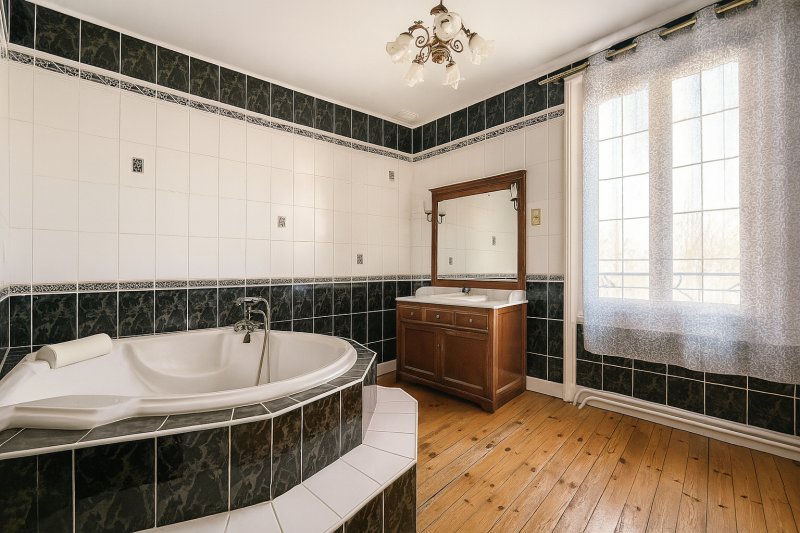 Cette maison de caractère vous offre, au rez-de-chaussée, une belle entrée, un WC, un séjour traversant est-ouest baigné de lumière avec cheminée, ainsi qu'une vaste cuisine aménagée et équipée ouvrant directement sur une terrasse menant à un jardin exposé sud-est.
