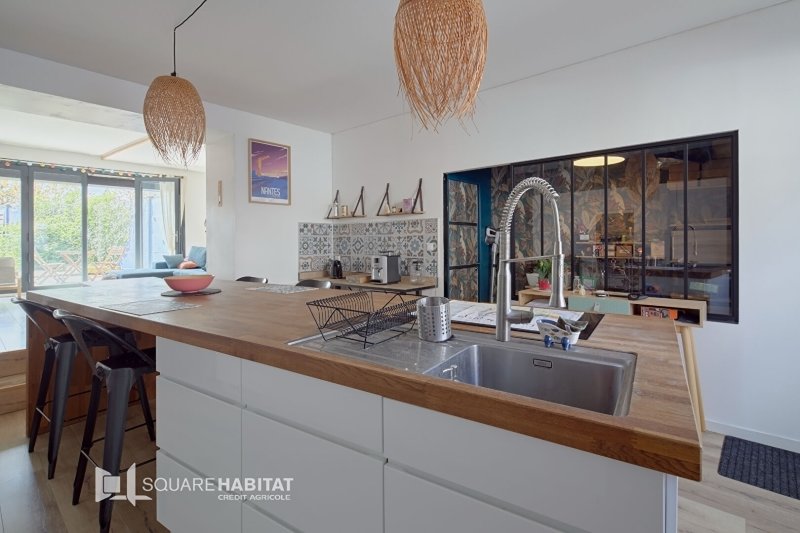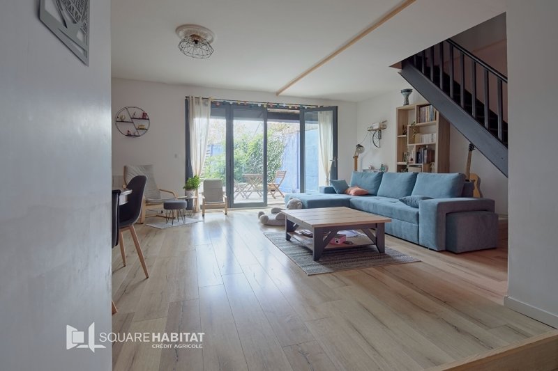 offre de beaux volumes et une luminosité remarquable. Entièrement rénovée, elle propose au rez-de-chaussée une cuisine moderne aménagée et équipée, ouverte sur un salon chaleureux, ainsi qu'un bureau, une buanderie et un WC.