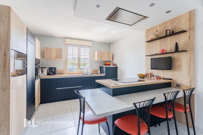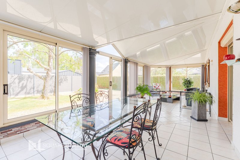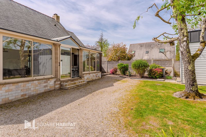 Au rez-de-chaussée, elle offre une belle pièce de vie avec poêle à pellets, une cuisine aménagée et équipée, une spacieuse véranda, un coin nuit disposant de deux chambres avec placards, WC et salle d'eau. Un bureau et un espace buanderie.