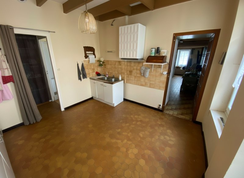 Maison de 100m² habitables, composée au rez de chaussée d'un salon/salle à manger de 32m² avec cheminée, une cuisine, une salle d'eau avec sèche serviette et un WC indépendant.