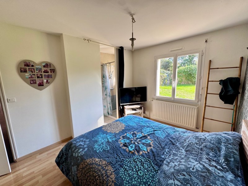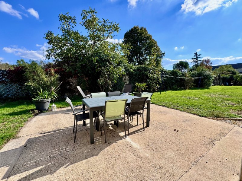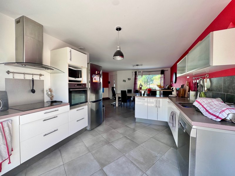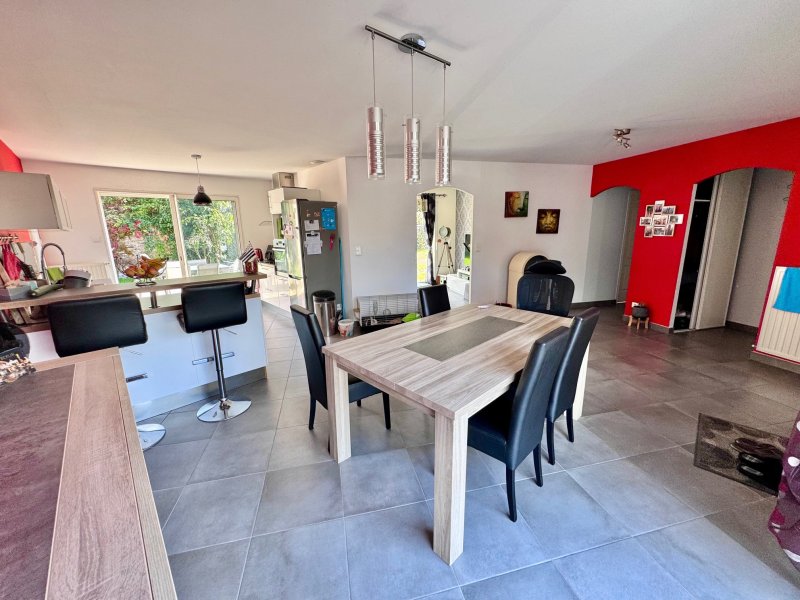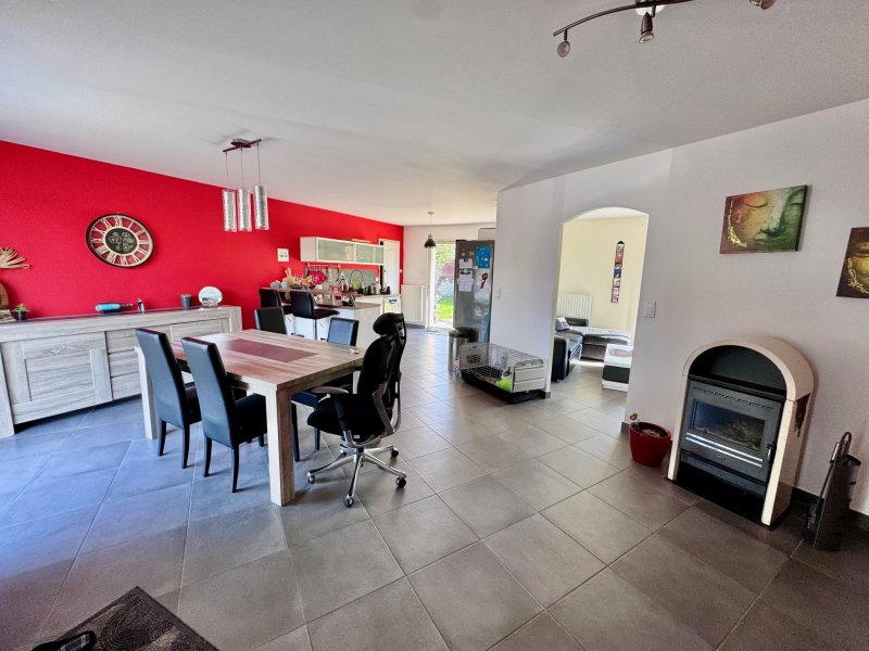 Dans le bourg, au calme de son impasse, plain-pied récent (2007) comprenant: entrée, cuisine aménagée ouverte sur salle à manger (poêle à bois), salon, 4 chambres dont une avec salle d'eau, salle de bain, wc, arrière cuisine/lingerie, garage et bureau. Le tout sur un terrain clos de 904 m2 environ.