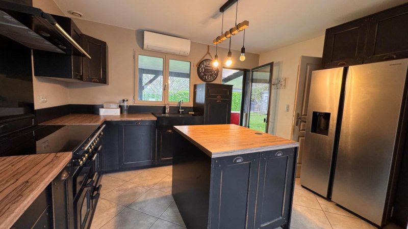 LEGE BOURG, villa ossature et bardage bois de 2007, d'env 139 m² sur plus de 800 m² de parcelle. En rdc, une cuisine aménagée et équipée ouverte sur séjour salon, une buanderie, deux chambres (dont une chambre d'enfant), salle de bains, wc. A l'étage une grande suite parentale (chambre + dressing + salle de bains wc). Et une grande pièce bureau sur le palier (poss de la fermer pour devenir 4ème chambre). Un garage divisé en cellier attenant, et une seconde partie accueille une pièce (idéal bureau en télétravail) avec couchage et s.eau wc en étage. Chauffage électrique + clim réversible + cheminée gaz. Jardin tourné vers la forêt, environnement qualitatif, et paisible.
