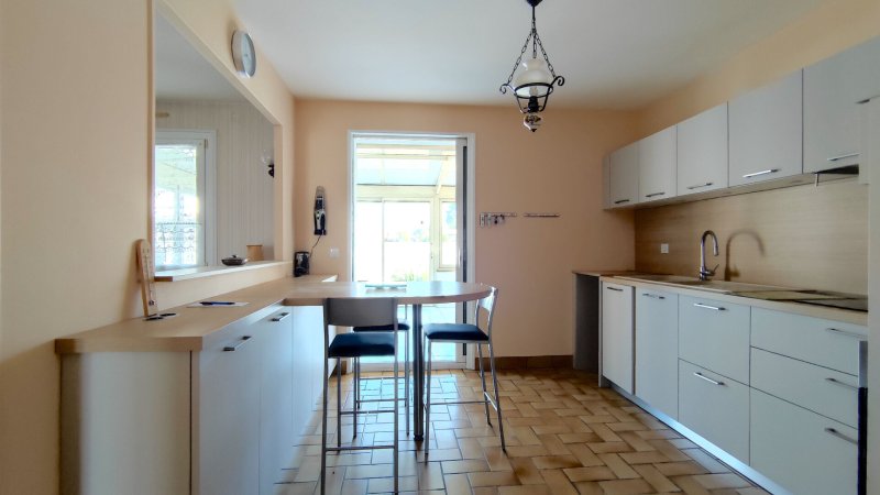 Concernant la maison, la pièce de vie de 27 m² spacieuse et lumineuse, avec une cuisine semi-ouverte, aménagée et équipée en 2024.